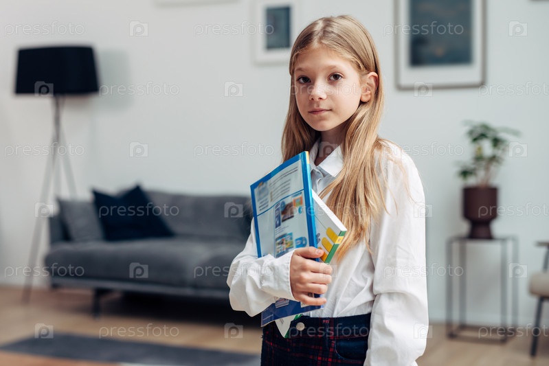 Девочка начальной школы стоит дома с учебником и смотрит в камеру