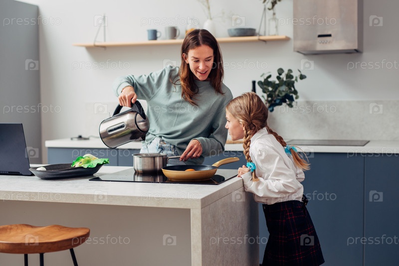 Женщина готовит еду рядом со своей любопытной дочерью-школьницей