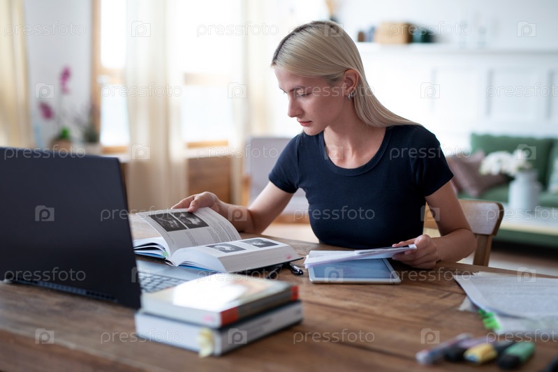 Студентка учится, читает книгу дома