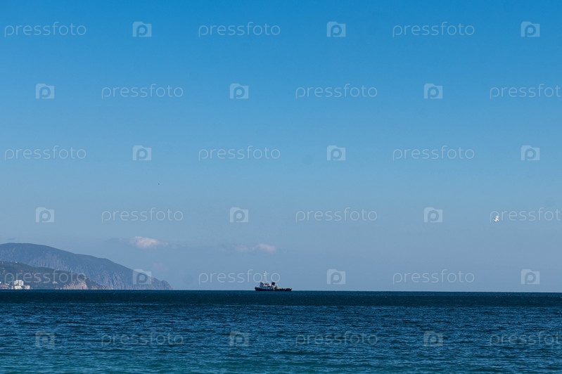 Вид на черное море. Вдали плывет корабль на фоне медведь горы. Крым