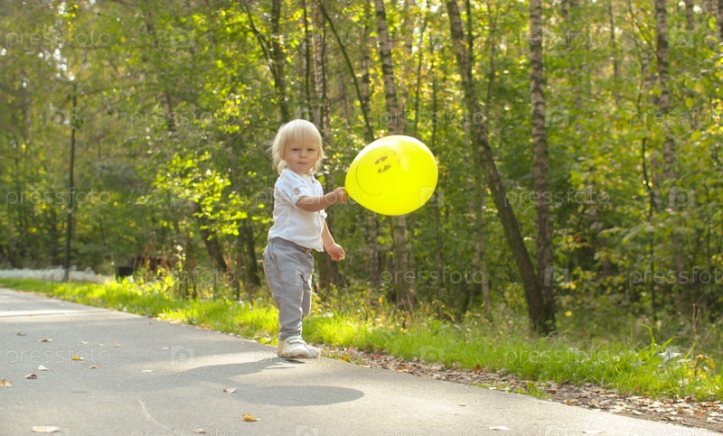 Маленький забавный ребенок с желтым шариком, играющий на дороге в парке