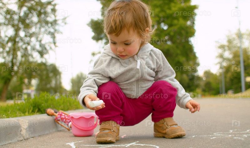 Маленькая милая девочка рисует на асфальте в парке