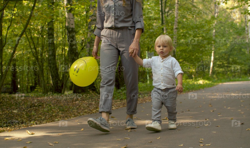 Мать и ее сын идут рука об руку. Молодая женщина и забавный ребенок в парке. День матери
