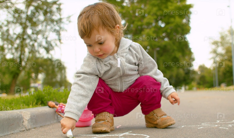 Маленькая милая девочка рисует на асфальте в парке