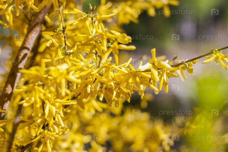 Кустарник с ярко-желтыми цветами. Крупный план с копией пространства на фоне природного ландшафта. Натуральные обои. Выборочный фокус