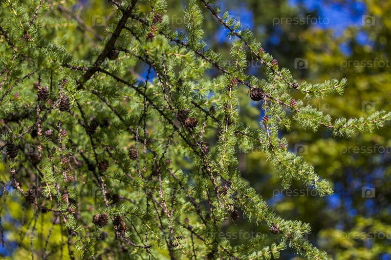 Молодые еловые ветки. Крупный план размытой зелени с копированием пространства, с использованием в качестве фона природного ландшафта, экологии, свежих концепций обоев. Выборочный фокус