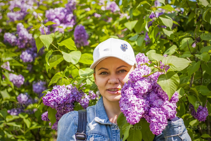 Молодая женщина в белой кепке позирует возле куста сирени. Портрет девушки. Взаимодействия. Выборочный фокус