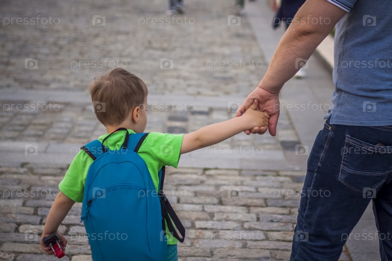 Отец держит сына за руку во время прогулки по городской улице. Путешествовать. Образ жизни в городе. Центр, улицы