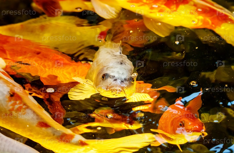 Много японских красных карпов в бассейне