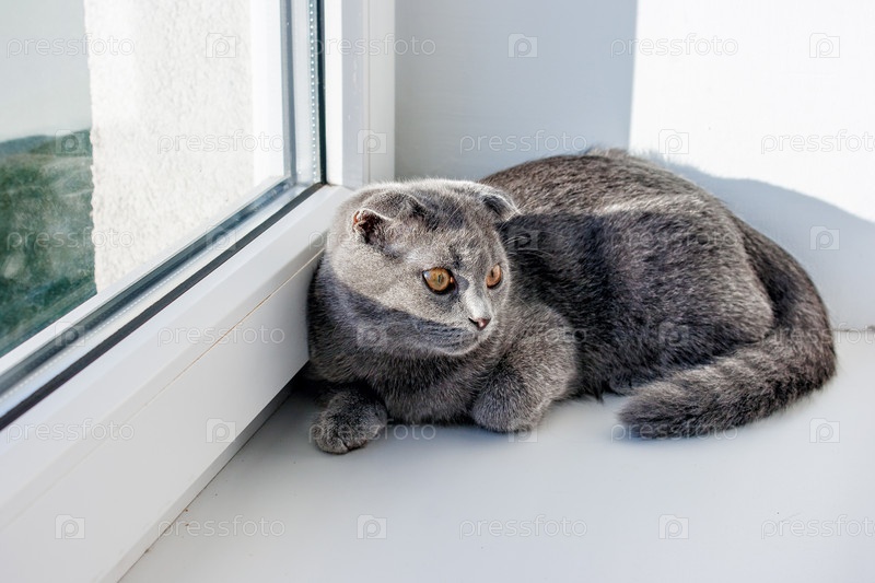 Вислоухий серый кот лежит на подоконнике