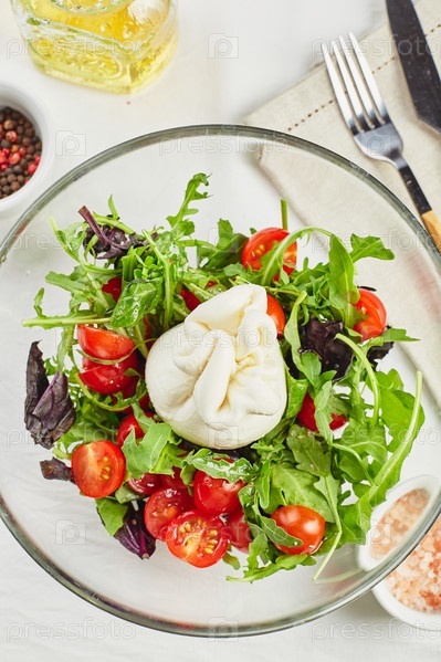 Буррата, итальянский свежий сыр из сливок и буйволиного или коровьего молока, с помидорами, рукколой, салатом и красным базиликом