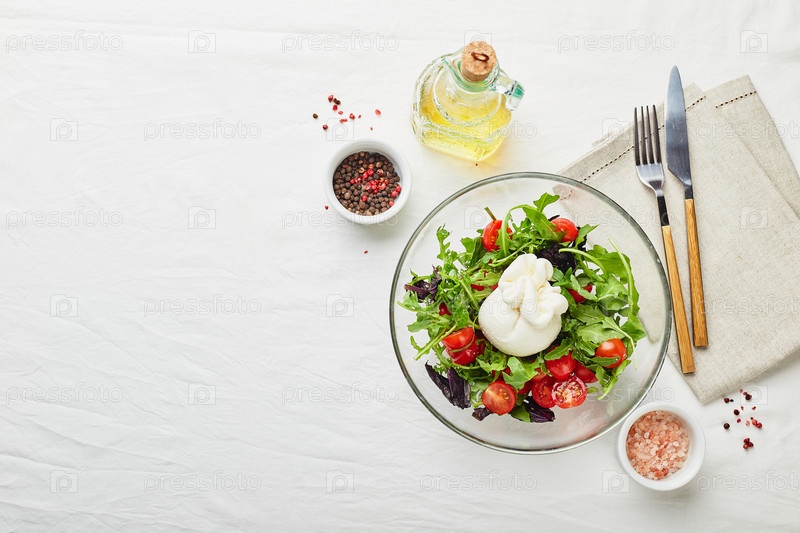 Буррата, итальянский свежий сыр из сливок и буйволиного или коровьего молока, с помидорами, рукколой, салатом и красным базиликом