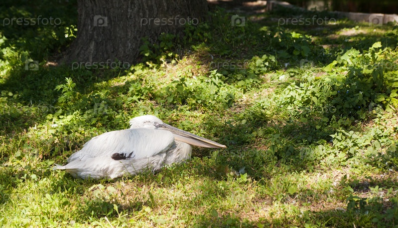 Белый пеликан лежит на зеленой траве в городском зоопарке