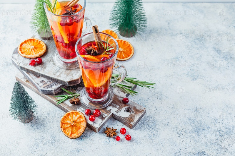 Горячий чай с дольками апельсина и клюквой в высоких стеклянных стаканах. Горячие напитки на зиму и Рождество. Место для текста