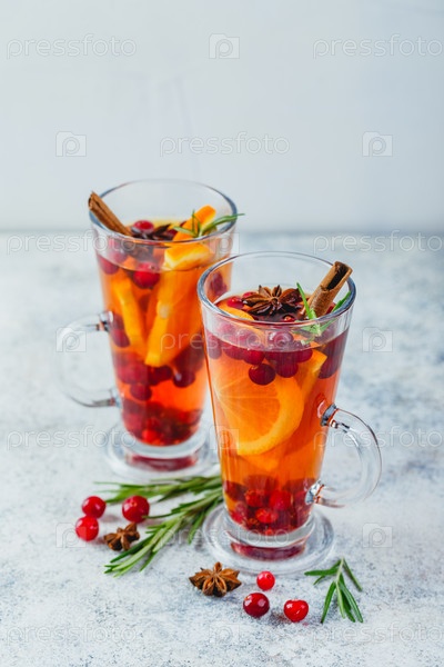 Горячий чай с дольками апельсина, клюквой и розмарином в высоких стаканах. Горячие напитки на зиму и Рождество