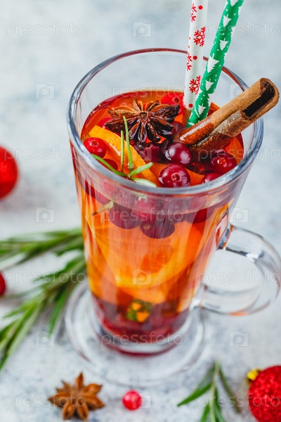 Горячий чай с дольками апельсина и клюквой в высоких стеклянных стаканах. Горячие напитки на зиму и Рождество. Крупным планом
