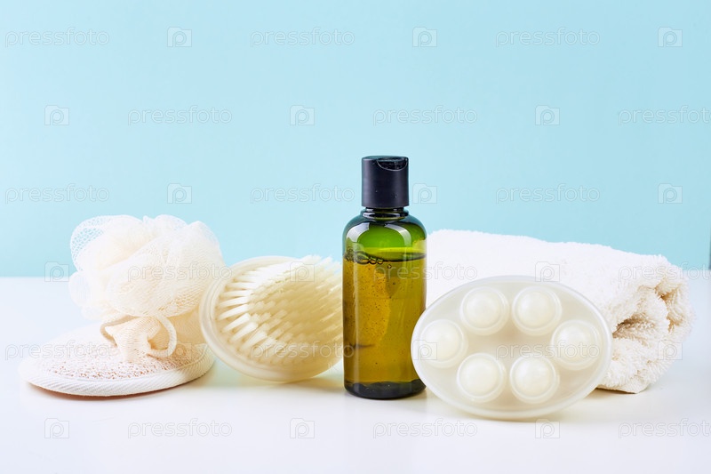 Аксессуары для ванной комнаты - шампунь, мочалка, полотенце и щетка для тела. Спа-композиция