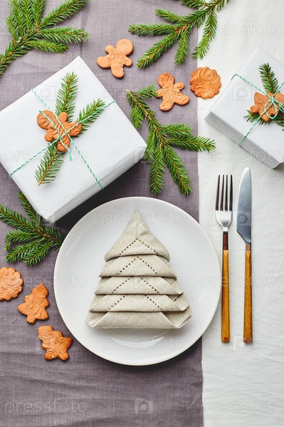 Рождественская праздничная сервировка стола, салфетка в виде елки на тарелке на белой скатерти с подарками и украшениями с еловыми веточками и пряниками