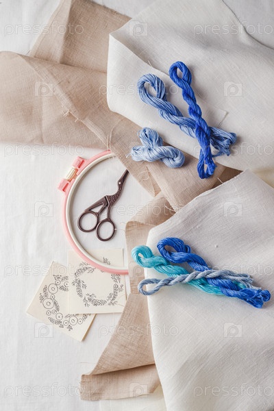 Набор для вышивки. Льняная ткань, схемы для вышивки, пяльцы, цветные нитки и иголки