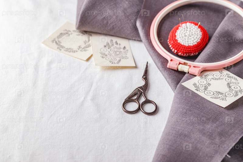 Набор для вышивки. Льняная ткань, схемы для вышивки, пяльцы, цветные нитки и иголки