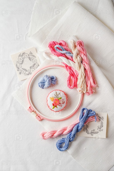 Набор для вышивания. Льняная ткань, схемы для вышивки, пяльцы, нитки розового цвета и иголки, вид сверху