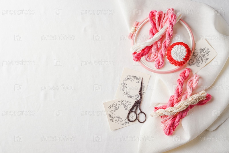 Набор для вышивания. Льняная ткань, схемы для вышивки, пяльцы, нитки розового цвета и иголки, вид сверху
