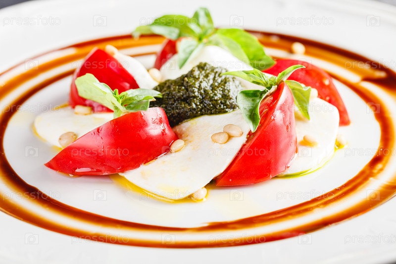Салат капрезе с моцареллой, помидорами, базиликом и соусом песто