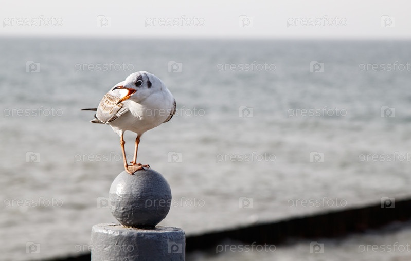 Чайка сидит на парапете у моря в осенний день