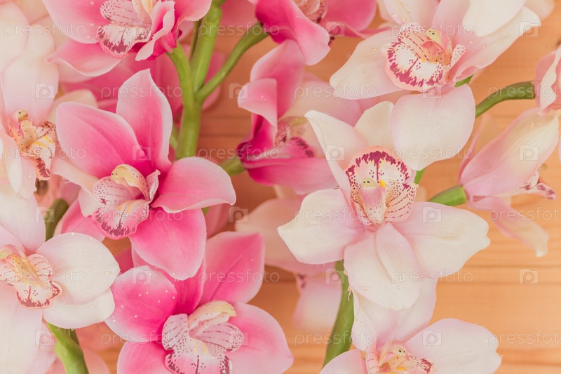 Букет искусственных цветущих цветов орхидеи на деревянном фоне. Дизайн интерьера