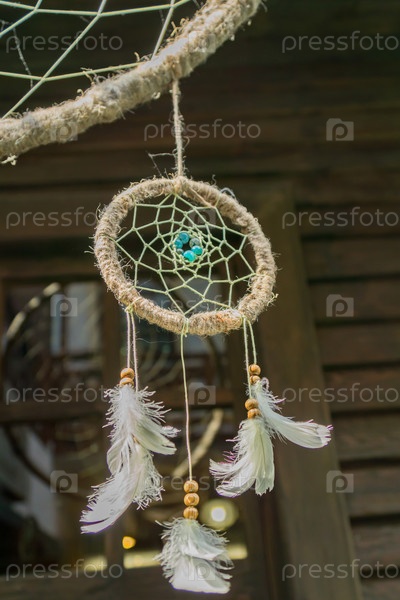 Крупный план ловца снов с перьями, висящими на открытом воздухе