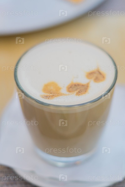 Закройте ванильный кофе раф в прозрачном стекле. Вкусный горячий напиток. Мягкий фокус