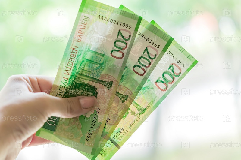 Женская рука держит новые российские банкноты у окна. двести рублей. Наличные бумажные деньги