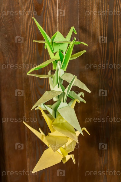 Украшение оригами - зеленые и желтые бумажные журавлики на деревянном фоне