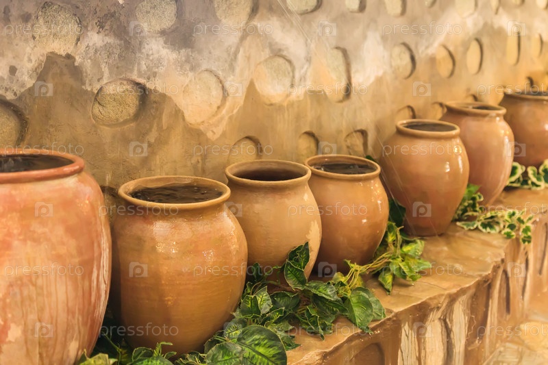 Старые глиняные горшки стоят в ряд. Большие банки с водой