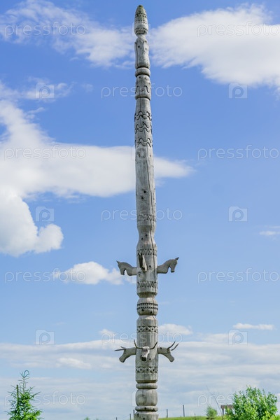 Резной деревянный столб на фоне голубого неба