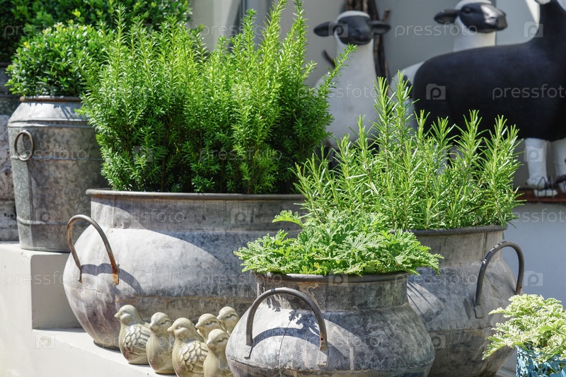 Растения и травы в деревенских металлических цветочных горшках для украшения интерьера и сада