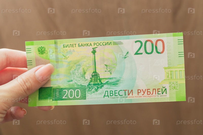Женская рука держит новую российскую банкноту на коричневом фоне. двести рублей. Наличные бумажные деньги