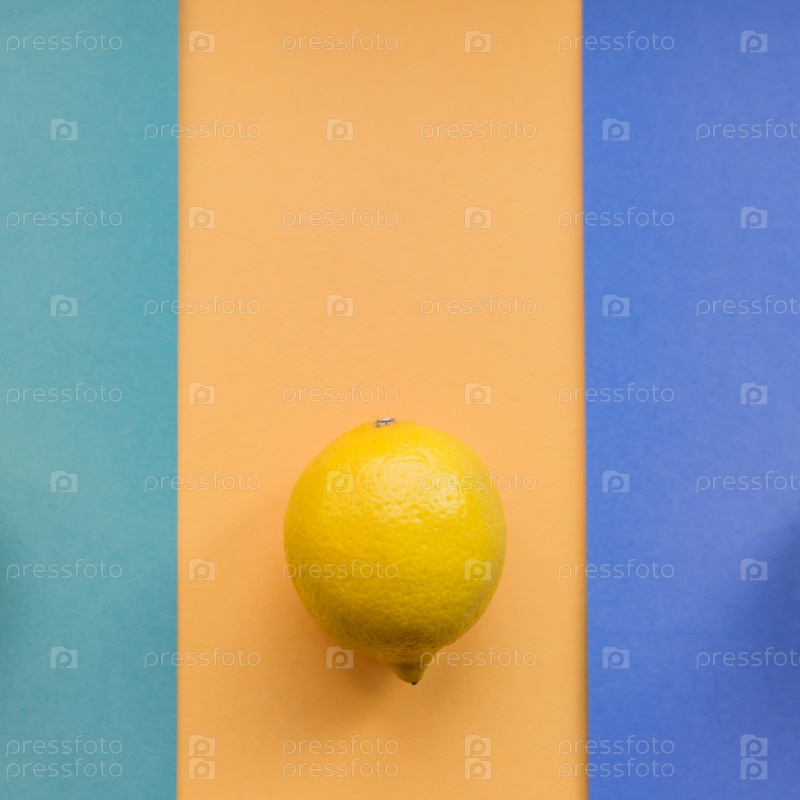 Лимон на красочном оранжевом, синем и зеленом фоне, вид сверху, минимальная плоская планировка