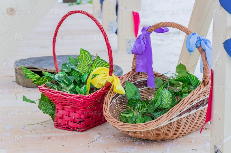 Две корзины с искусственными листьями на улице зимой