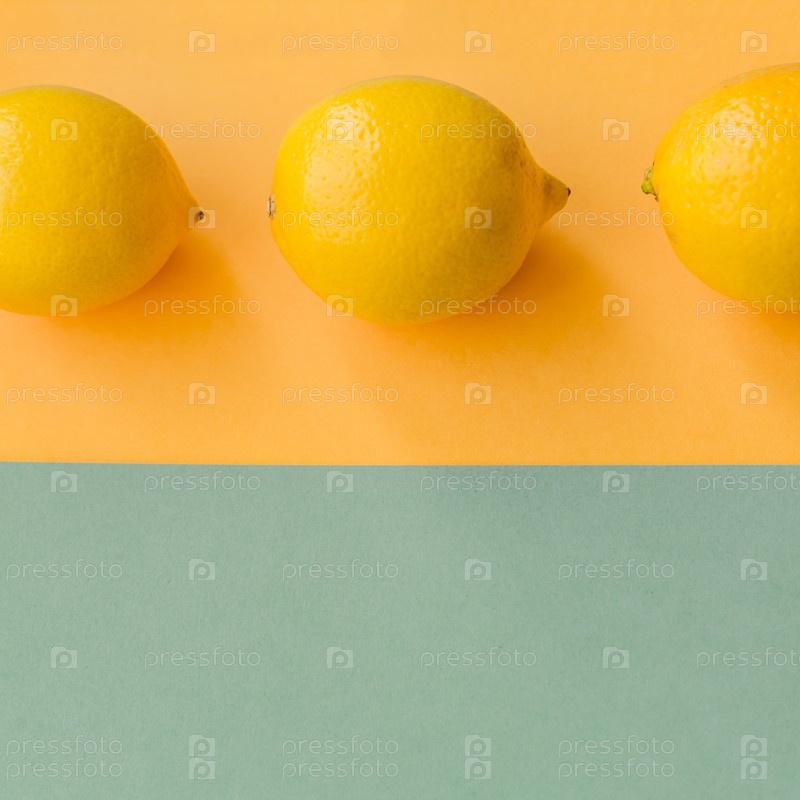 Три лимона на красочном оранжевом и зеленом фоне, вид сверху, минимальная плоская планировка