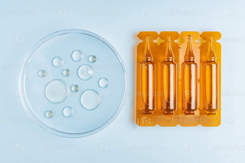 Масло или сыворотка для ухода за волосами в коричневых пластиковых ампулах или капсулах на синем фоне с образцами масла в чашке Петри, макет маркетинга продукта