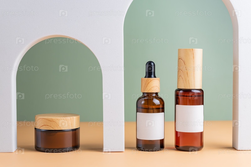 Макет коричневых косметических бутылок с дозатором и белой этикеткой и бутылка с пипеткой в белых арочных дверях для косметической фотографии на бежевом фоне