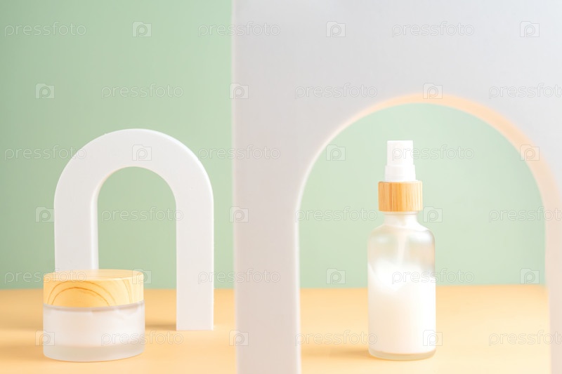 Смоделируйте стеклянную бутылку-капельницу и банку с кремом для лица на белом подиуме на бежевом фоне с мягкими тенями. Средства по уходу за кожей в модной презентации