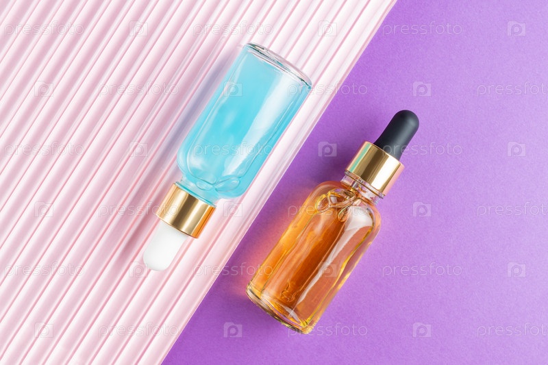 Сыворотка для лица с коллагеном красоты в стеклянных бутылках-капельницах на двойном фиолетовом и розовом фоне. Модная съемка упаковки косметики. Эфирное масло с натуральными ингредиентами