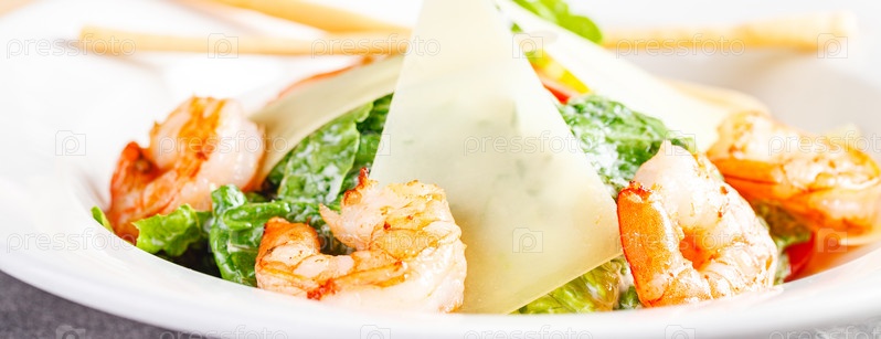 Салат Цезарь из морепродуктов с креветками, листьями салата, гренками, помидорами черри и сыром пармезан, крупным планом. Длинный широкий баннер