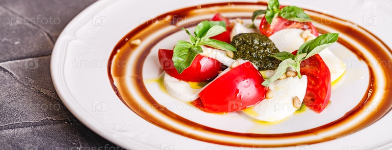 Салат капрезе с моцареллой, помидорами, базиликом и соусом песто на белой тарелке. Длинный широкий баннер