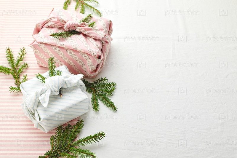 Рождественская экологически чистая подарочная упаковка в традиционном японском стиле фурушики, украшенная ветвями еловых деревьев на фоне ткани, экологически чистая подарковая упаковка и концепция Zero Wast