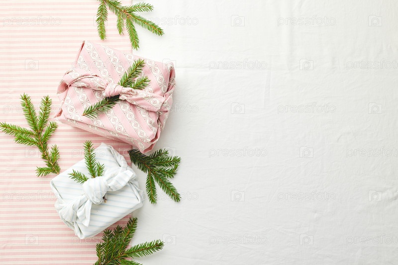 Рождественская экологически чистая подарочная упаковка в традиционном японском стиле фурушики, украшенная ветвями еловых деревьев на фоне ткани, экологически чистая подарковая упаковка и концепция Zero Wast