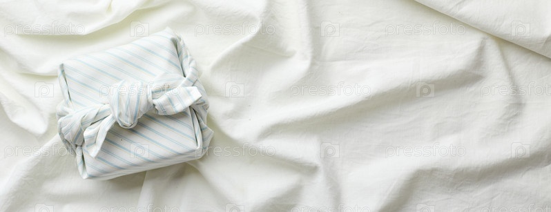 Экологическая подарочная упаковка в традиционном японском стиле фурушики на тканевом фоне, экологически чистые подарки и концепция Zero Wast