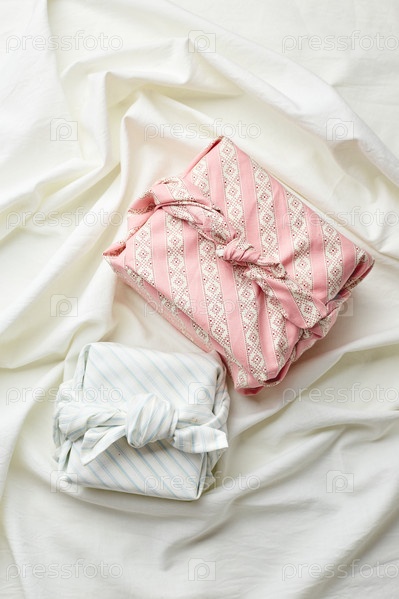 Экологическая подарочная упаковка в традиционном японском стиле фурушики на тканевом фоне, экологически чистая подарковая упаковка и концепция Zero Wast